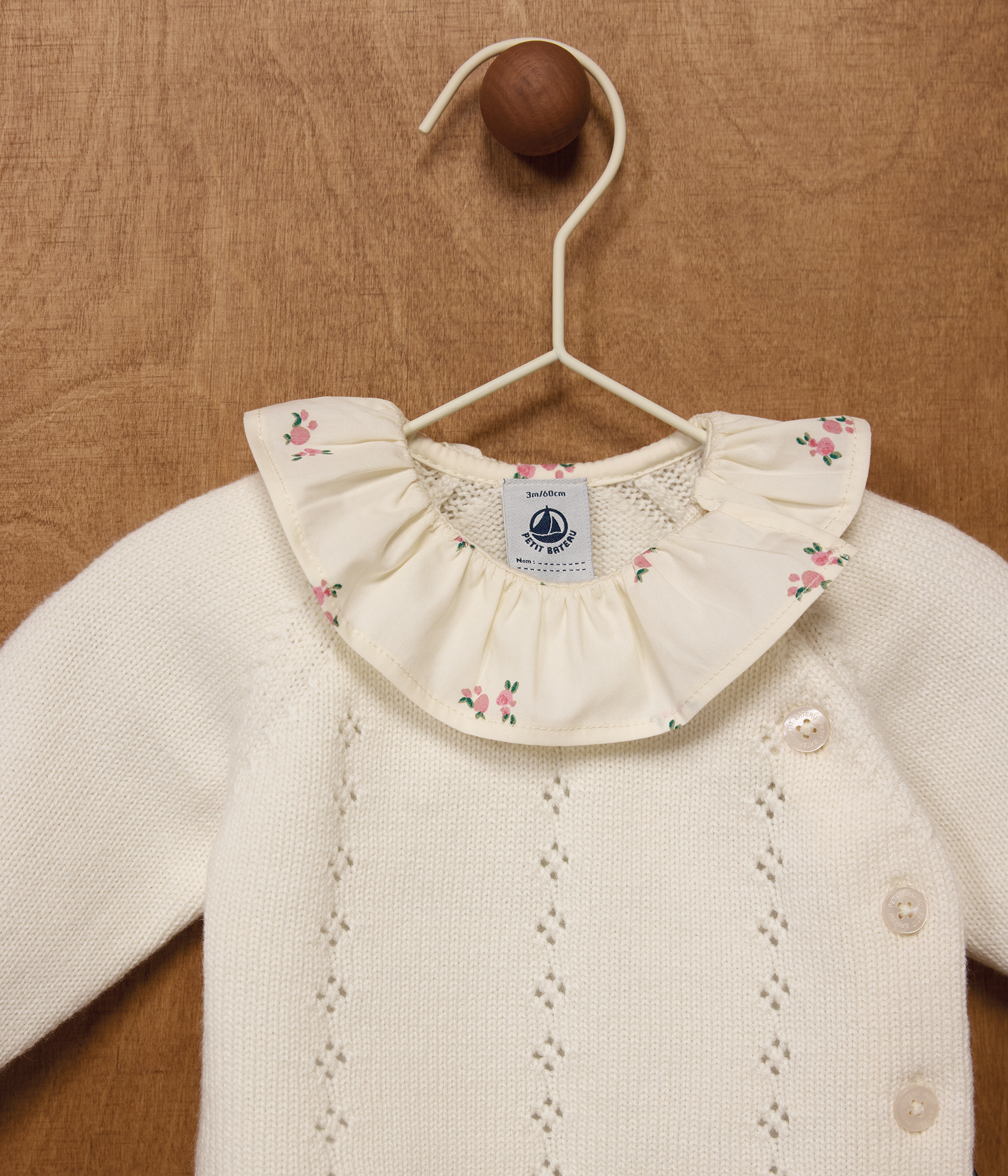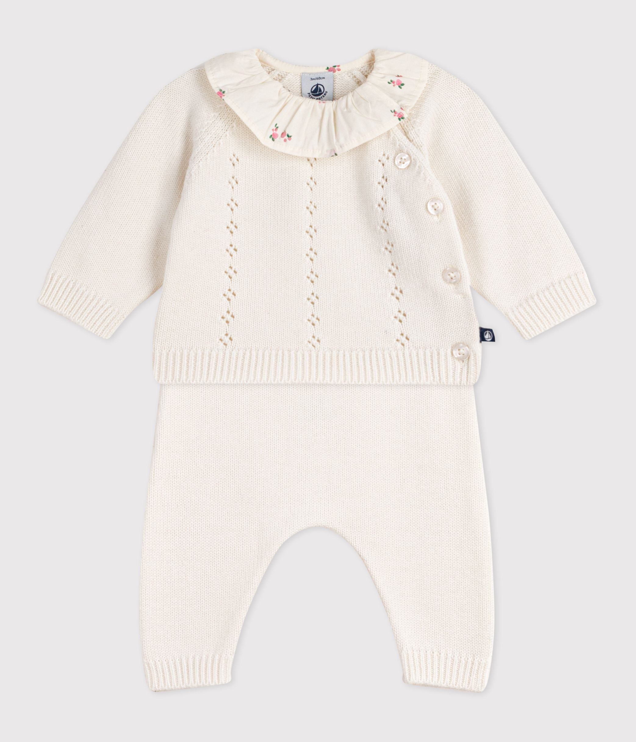 Babies' 2-piece set in wool and cotton with a flower-patterned ruff