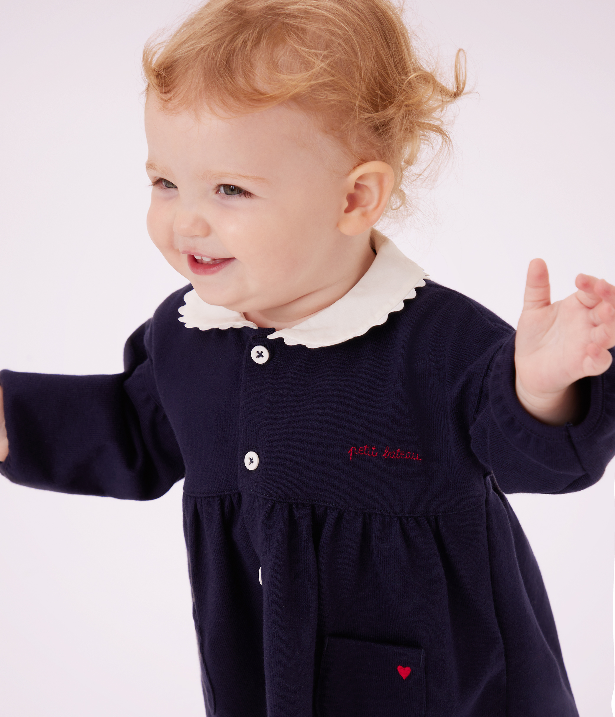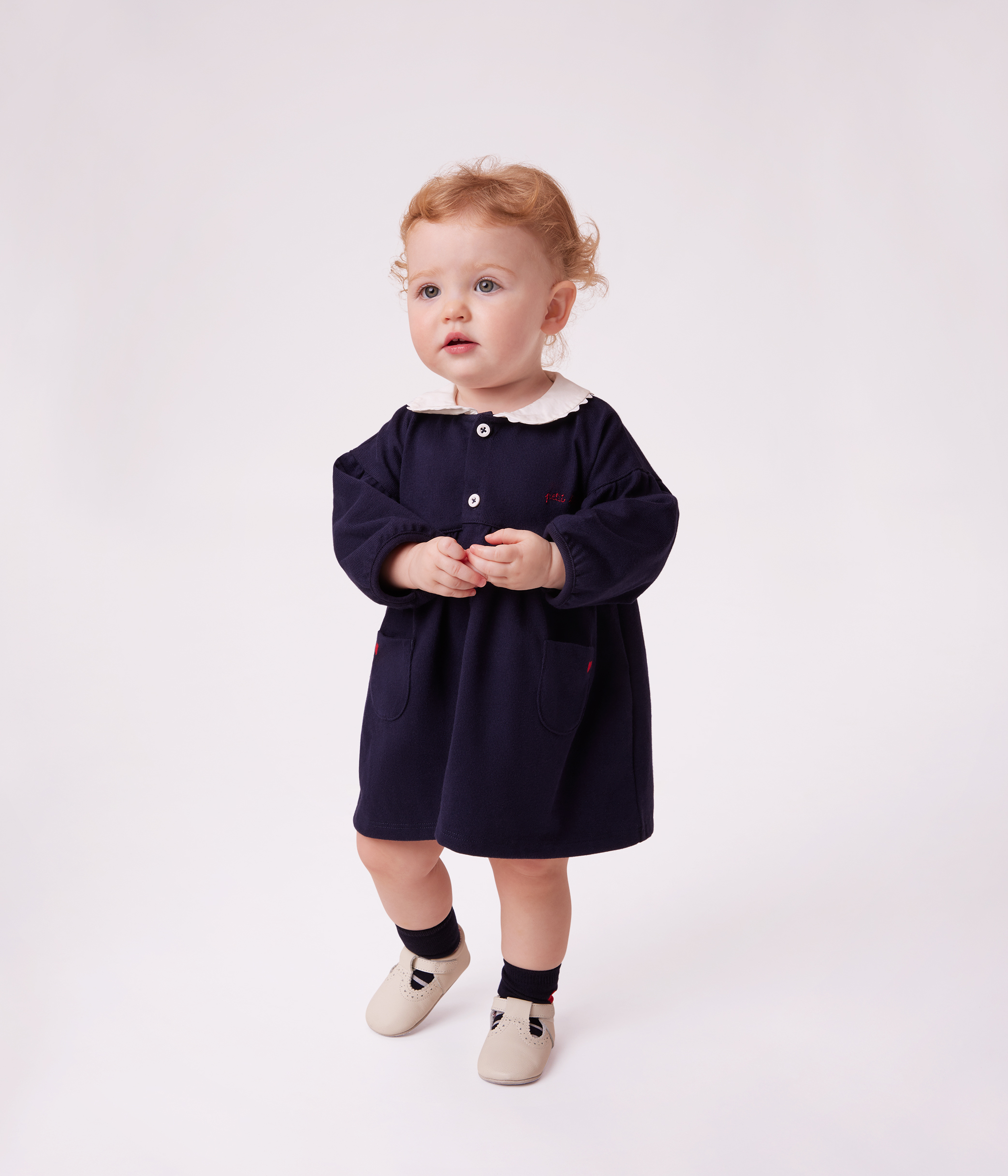 Babies' long-sleeved plain cotton dress with embroidered details on the collar