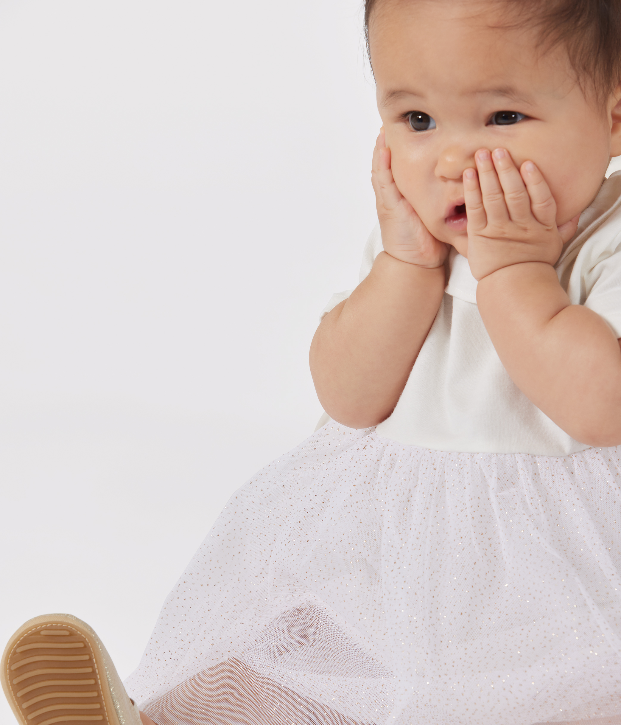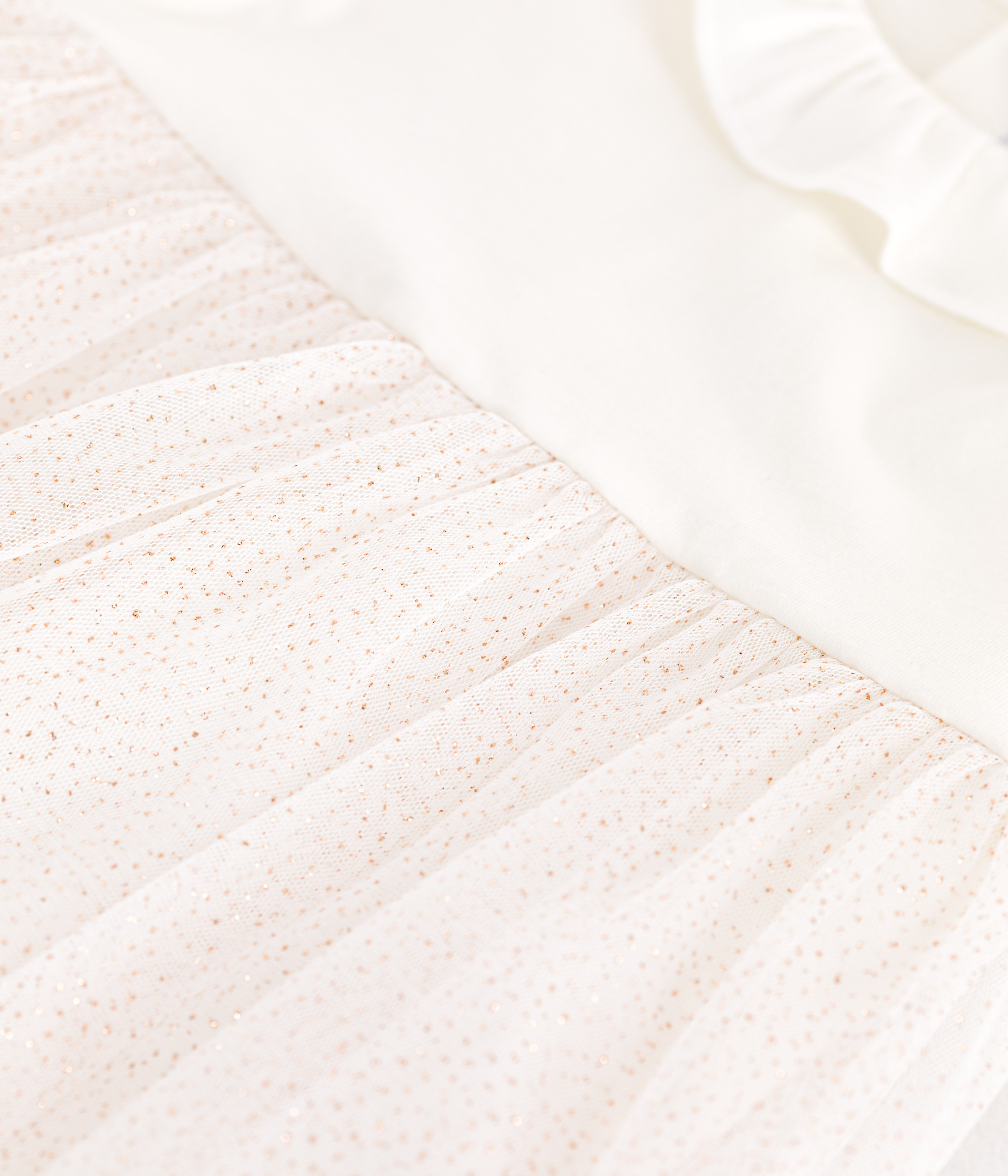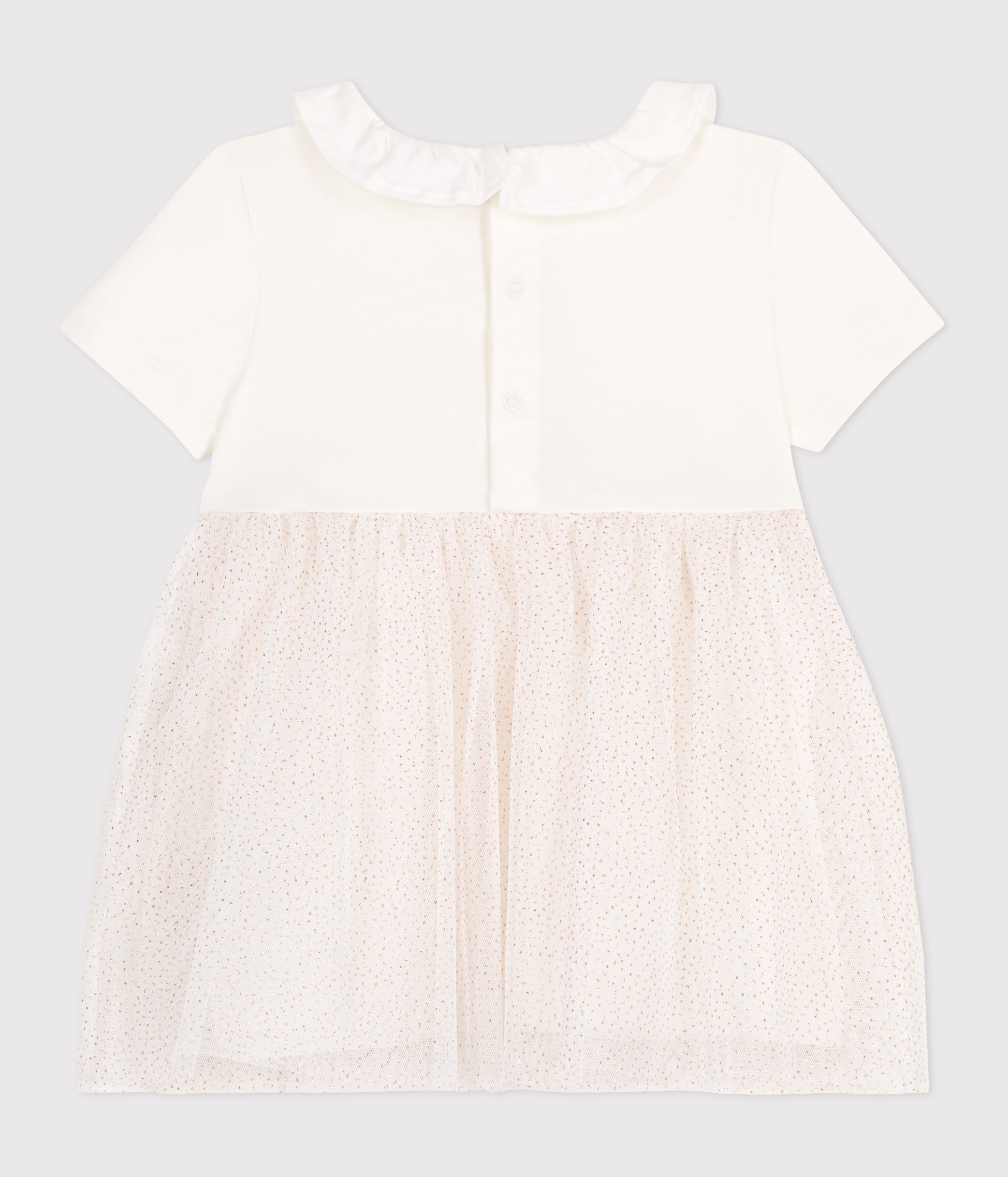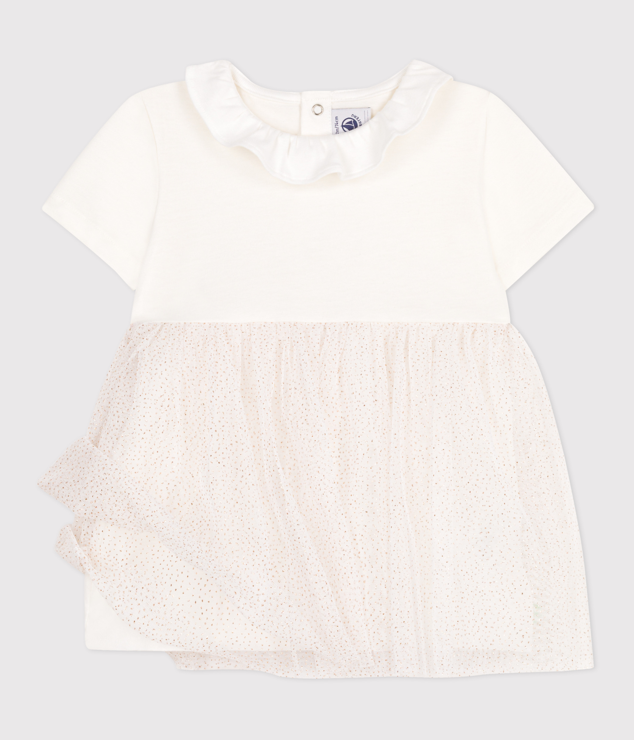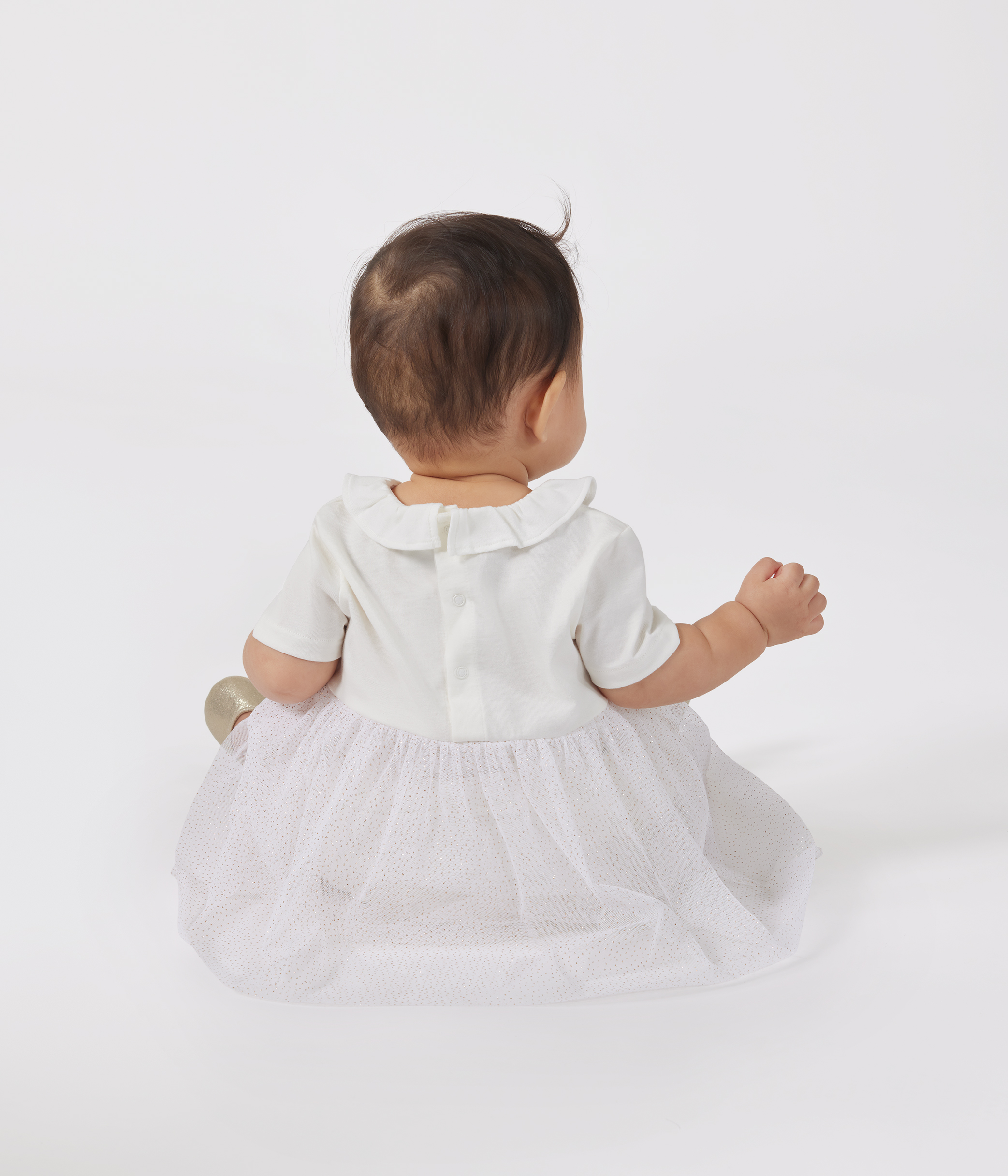 Babies' short-sleeved cotton and tulle dress with a ruff