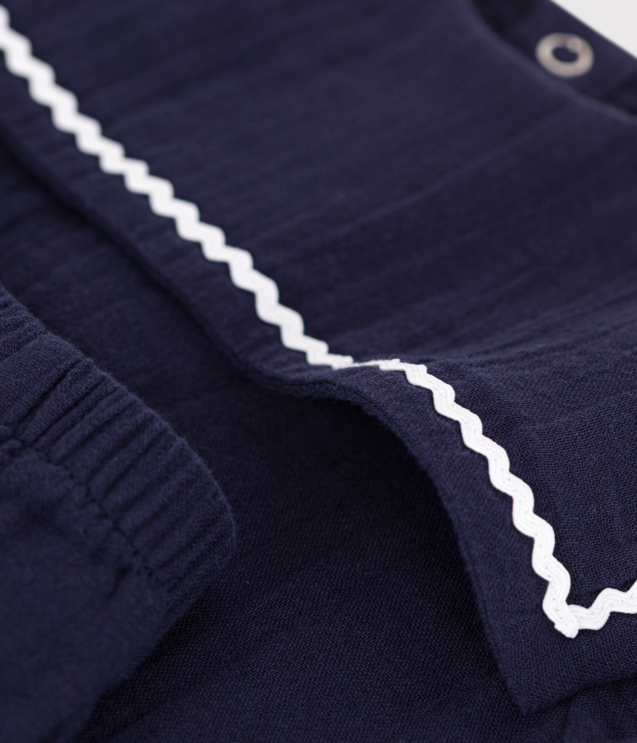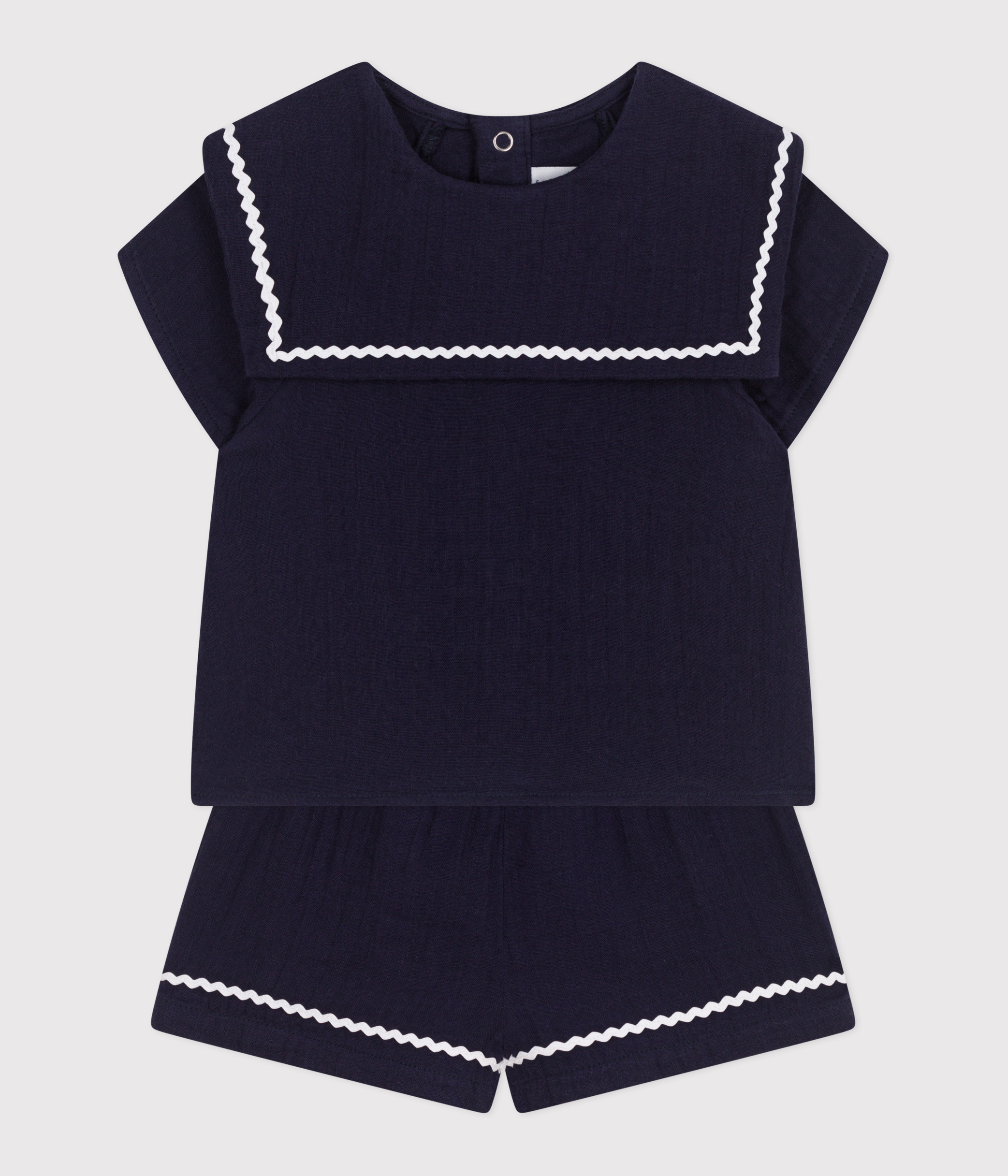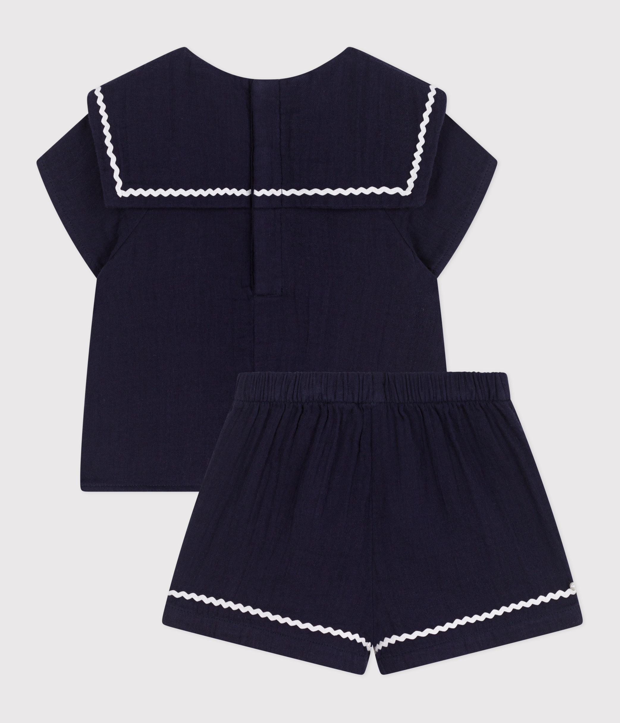 Iconic outfit for girls, made in cotton gauze, a light, comfortable fabric finished with rick-rack braid.