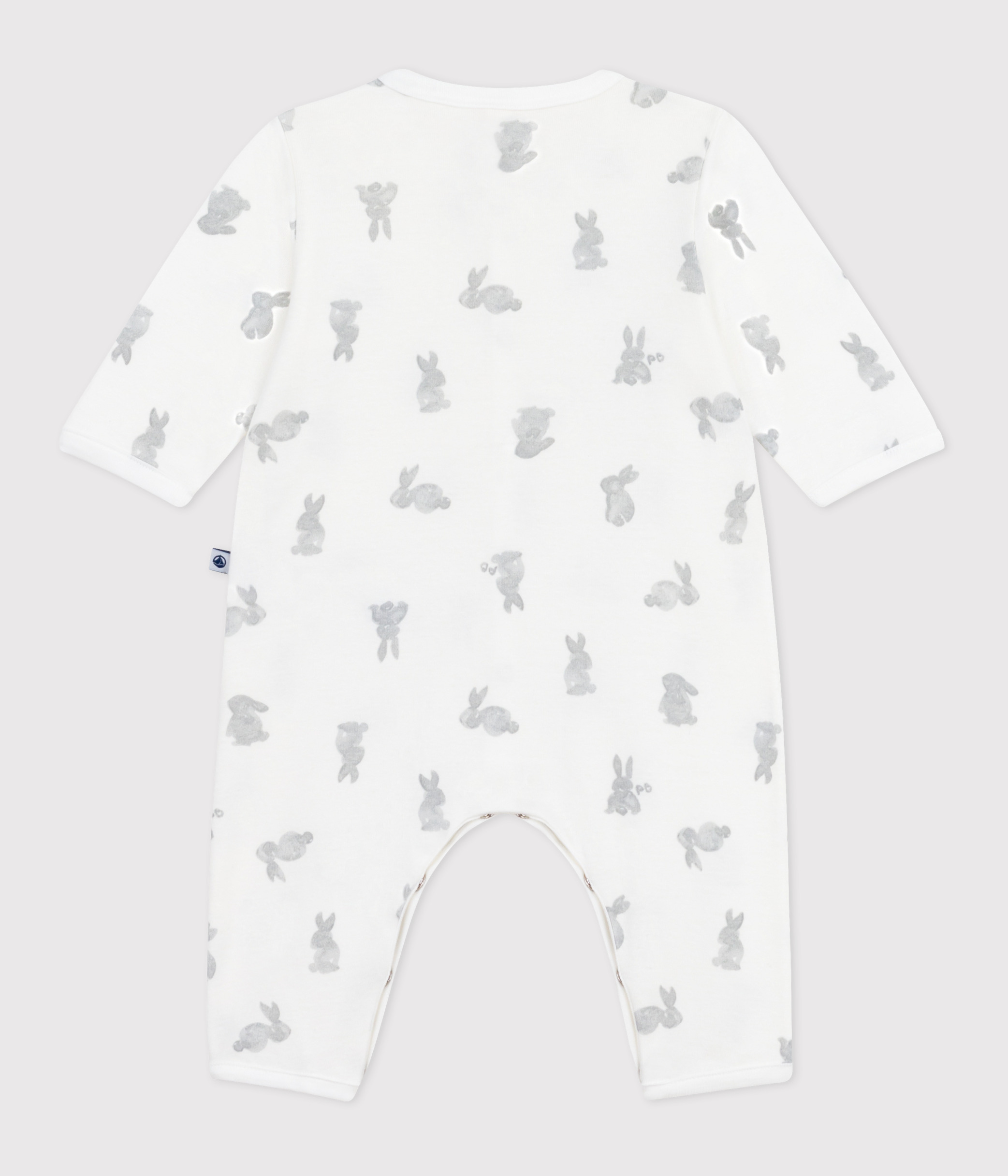 - The pyjama suit is opened and fastened with poppers at the front and between the legs.