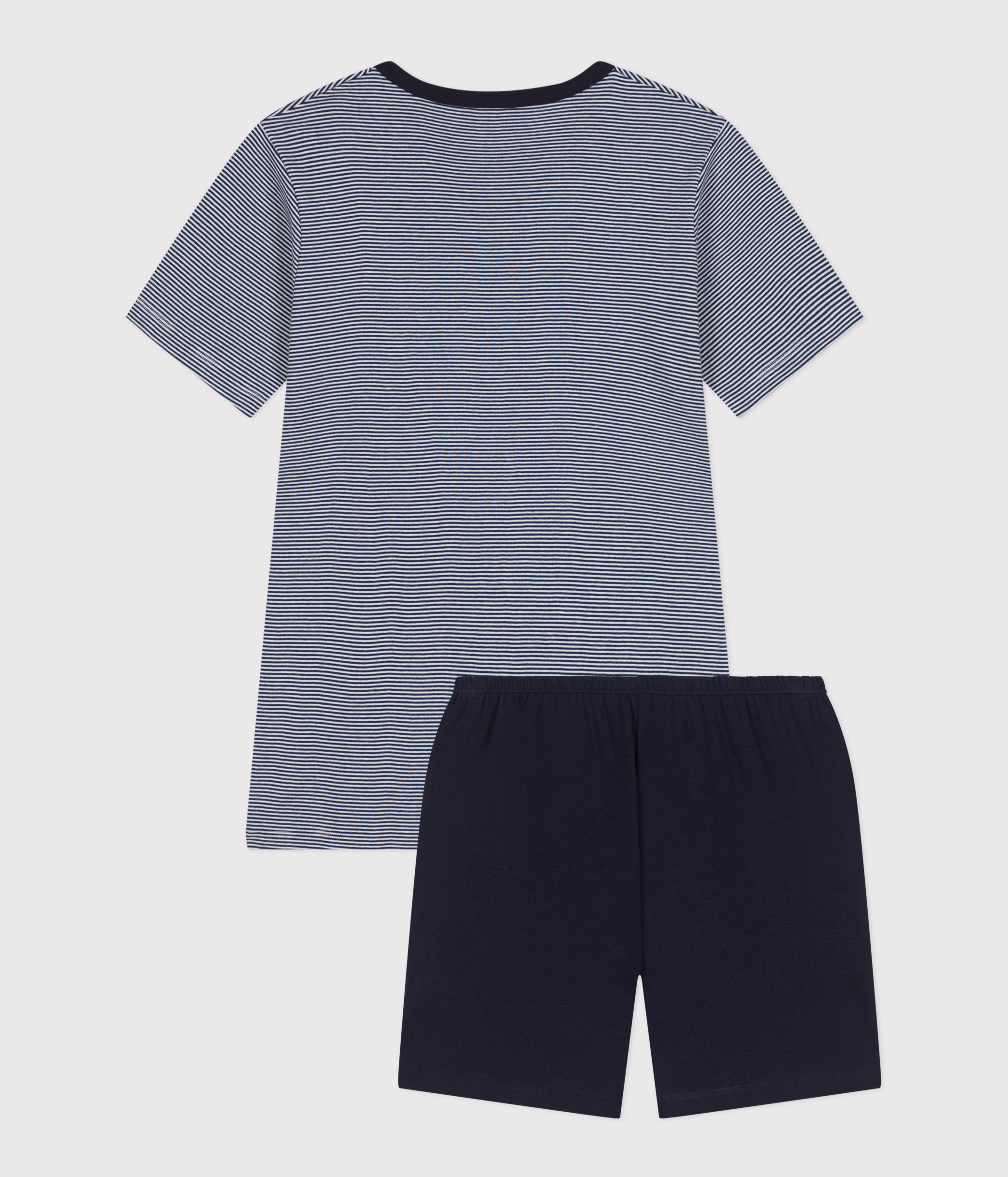 - The shorts have an elasticated waistband and are in plain midnight blue 1x1 rib. The colour is repeated at the neckline and on the T-shirt pocket.