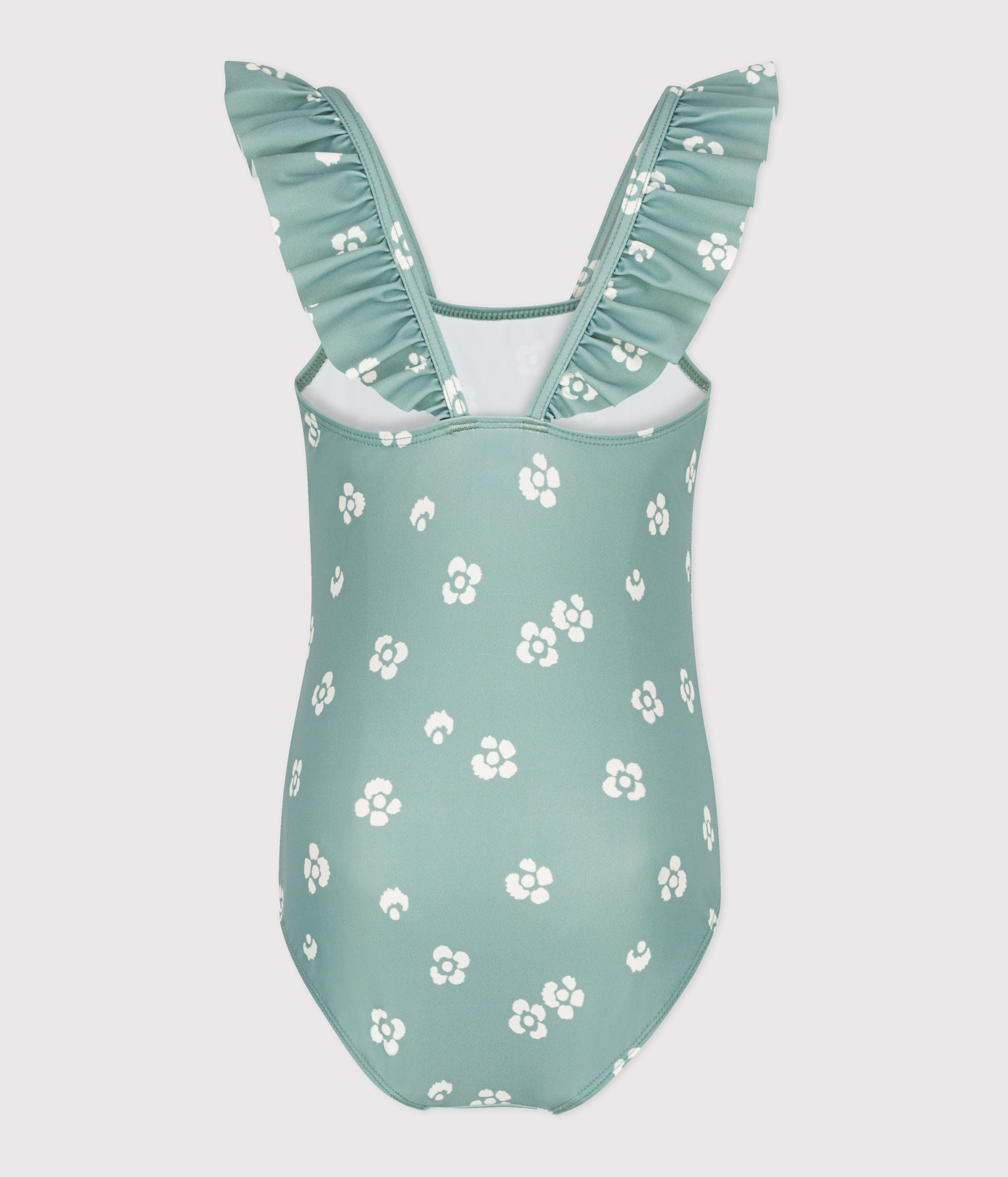 A very feminine girls' one-piece swimsuit with ruffles and a floral print!