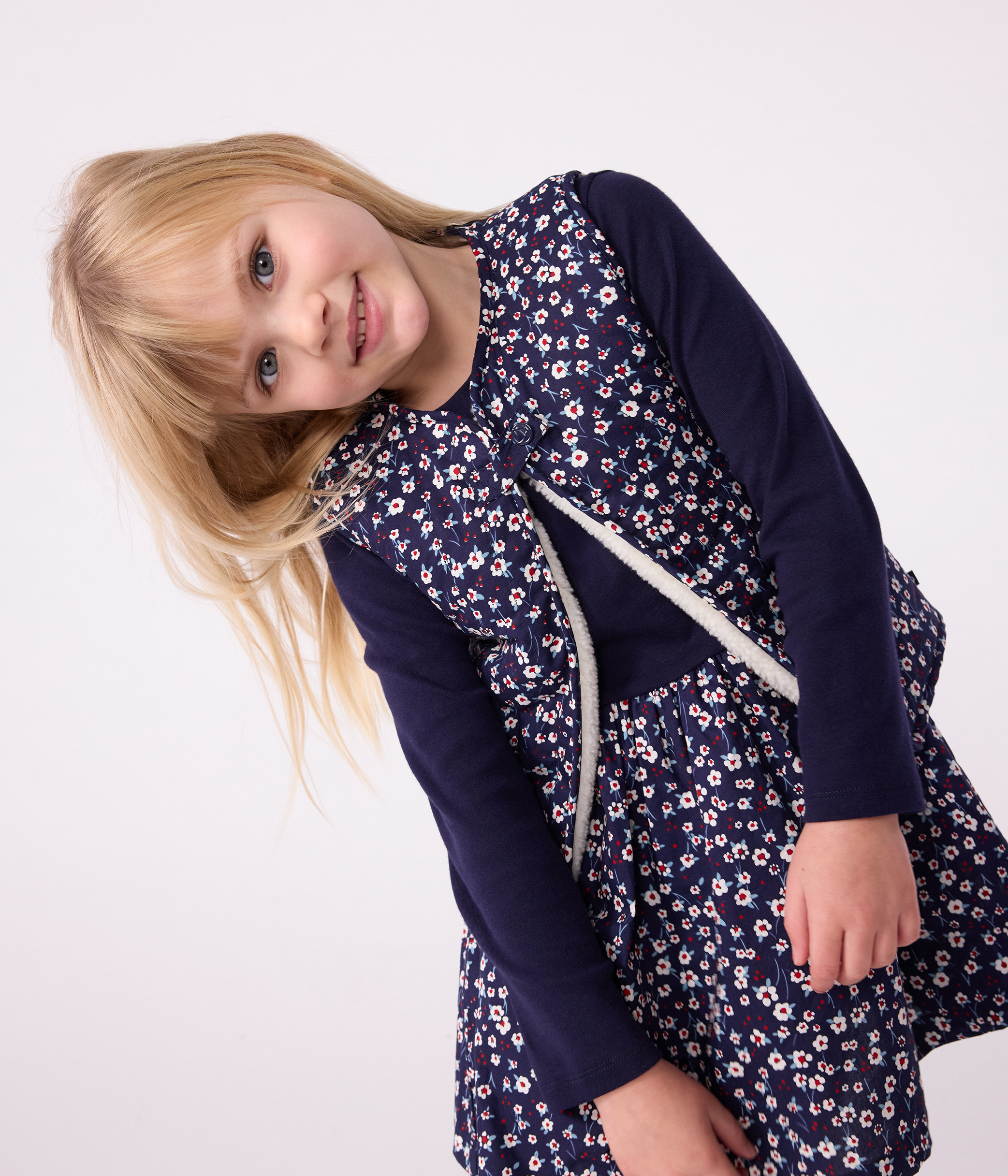 Children's sleeveless cardigan in printed cotton poplin and sherpa