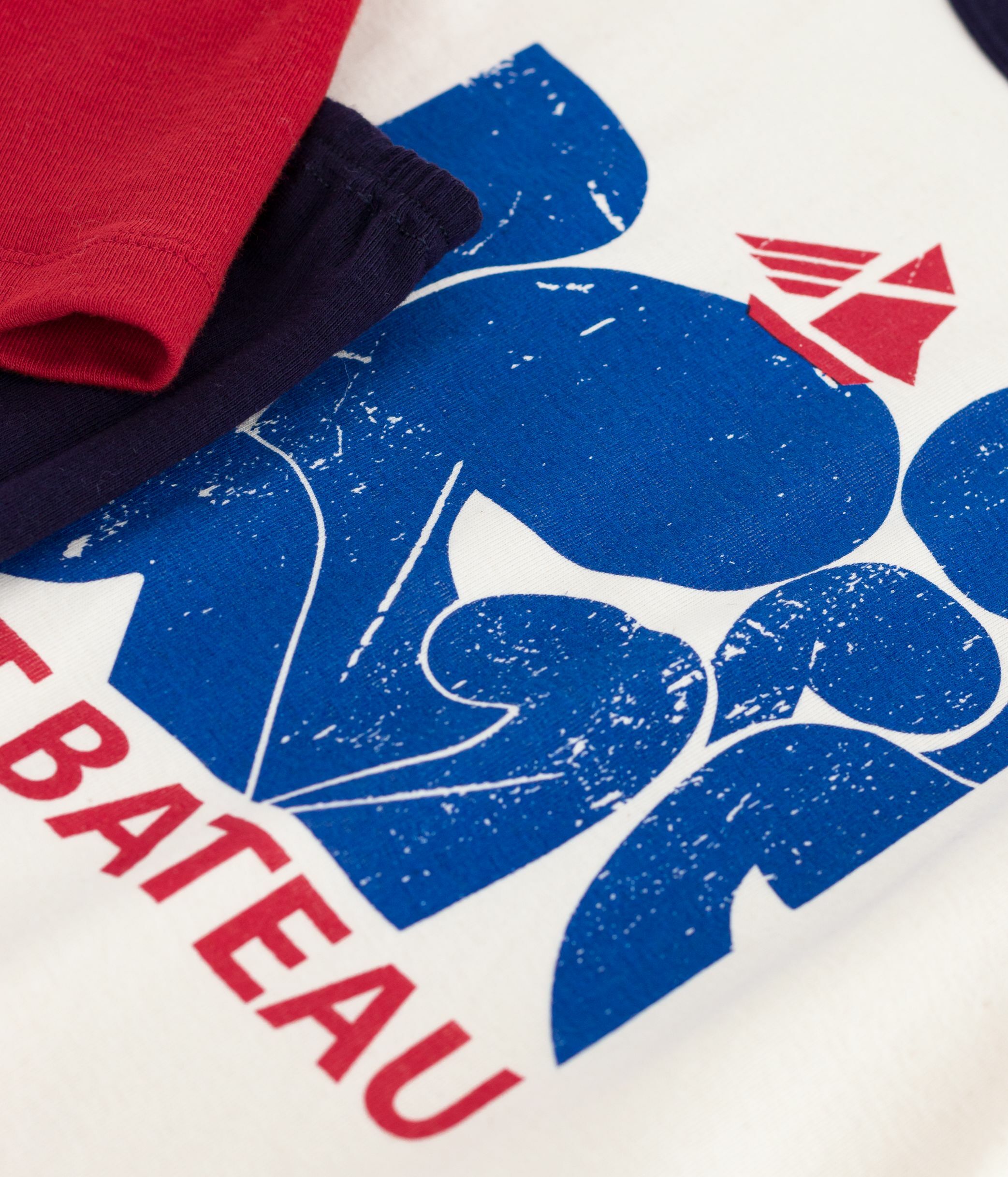 - The front and back of the T-shirt top are off-white, with contrasting red 1x1 rib knit sleeves and collar, and the pyjama bottoms are dark blue 1x1 rib knit.
